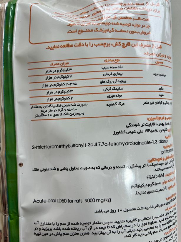 کاپتان برای طیف گستردهای از بیماریهای قارچی نظیر بوته میری، سفیدکهای داخلی، پوسیدگی تلخ سیب، لکه سیاه سیب و گلابی، لکه غربالی، لب شتری هلو، مرگ گیاهچه و… استفاده میشود.