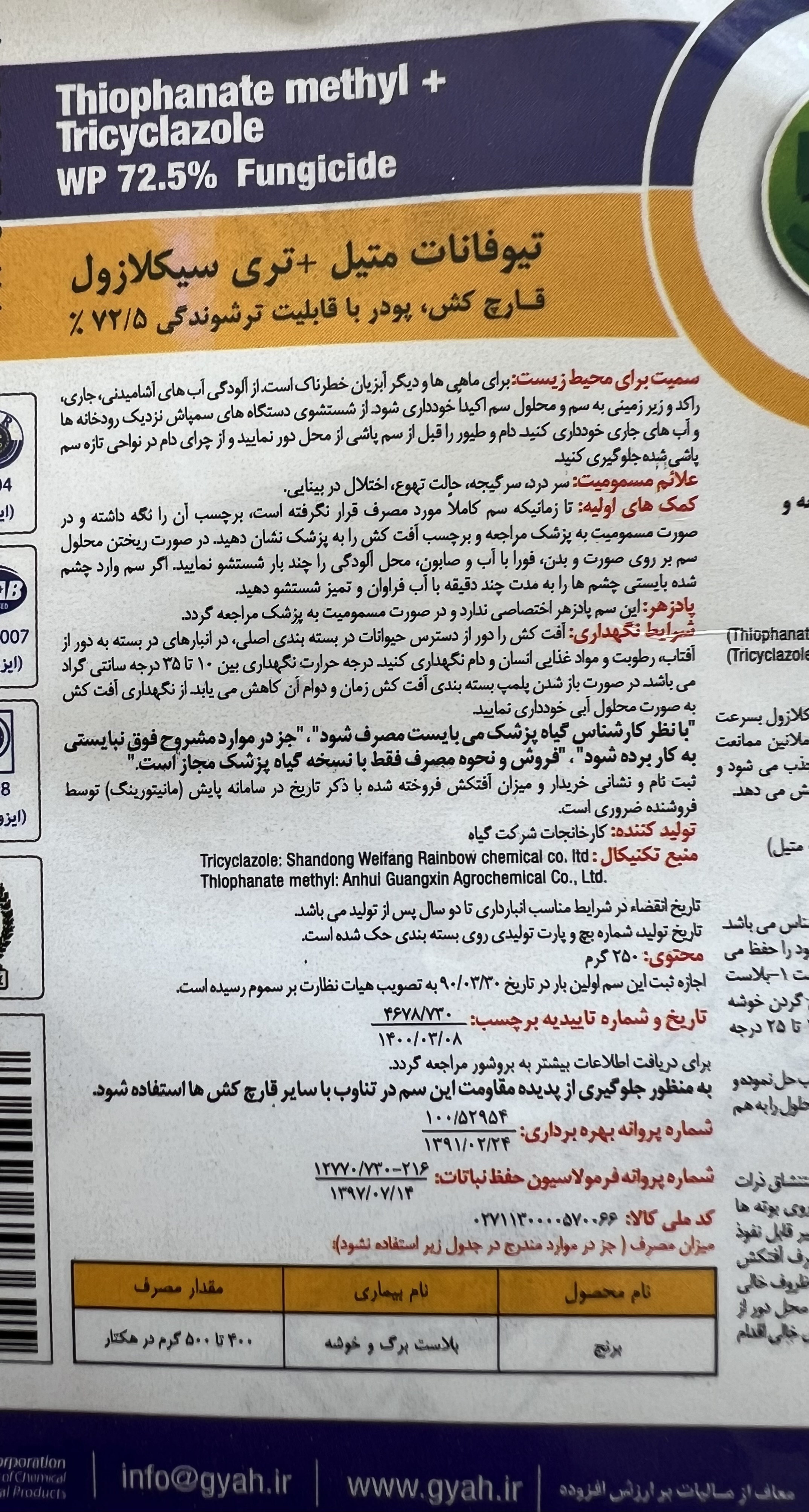 این قارچکش برای کنترل بیماریهای لکه برگی و به خصوص بلاست برگ و خوشه برنج اثر بینظیری دارد.