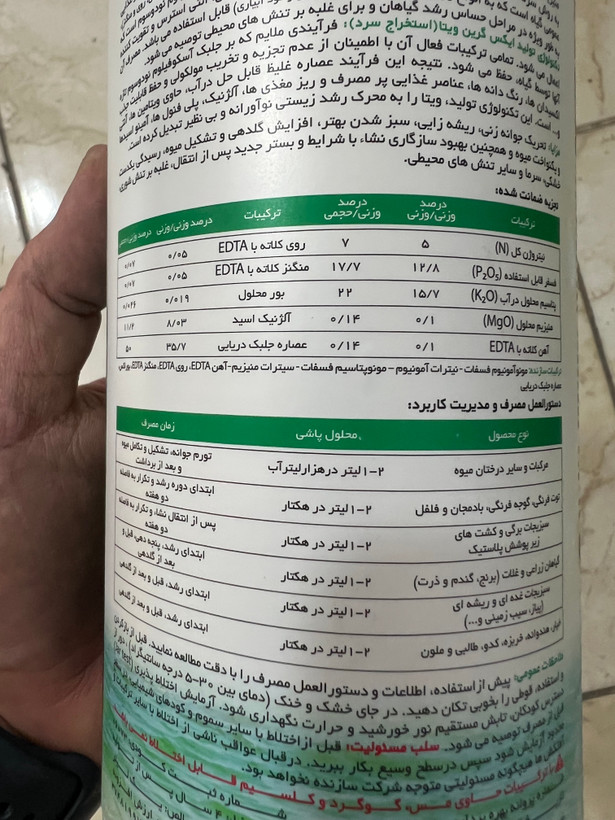 ترکیبات: عصاره جلبک دریایی، نیتروژن، فسفر، پتاسیم، منیزیوم، آهن، روی، منگنز، بور و آلژنیک اسید