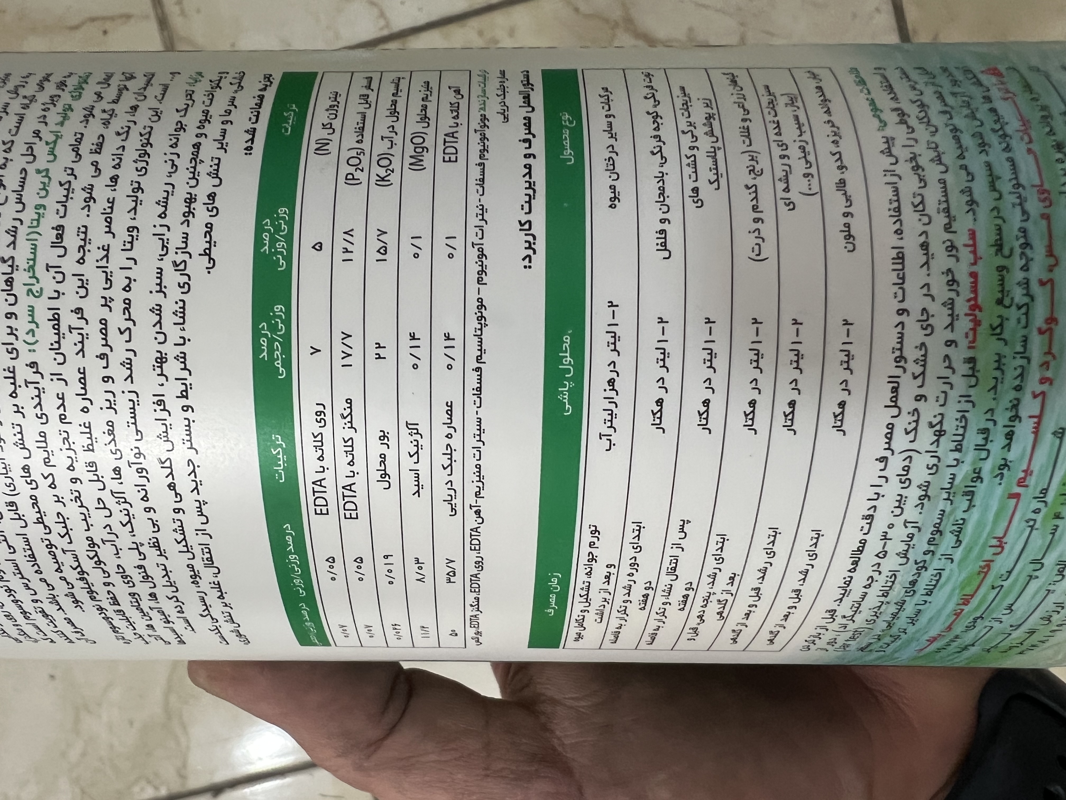 ترکیبات: عصاره جلبک دریایی، نیتروژن، فسفر، پتاسیم، منیزیوم، آهن، روی، منگنز، بور و آلژنیک اسید