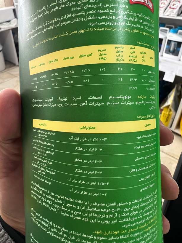 ترکیبات: عناصر ماکرو(نیتروژن-فسفر-پتاسیم) + عناصر میکرو(آهن-روی-منگنز-منیزیم-مولیبدن-بور) + آمینو اسید + ویتامینهای B1 B2 C E