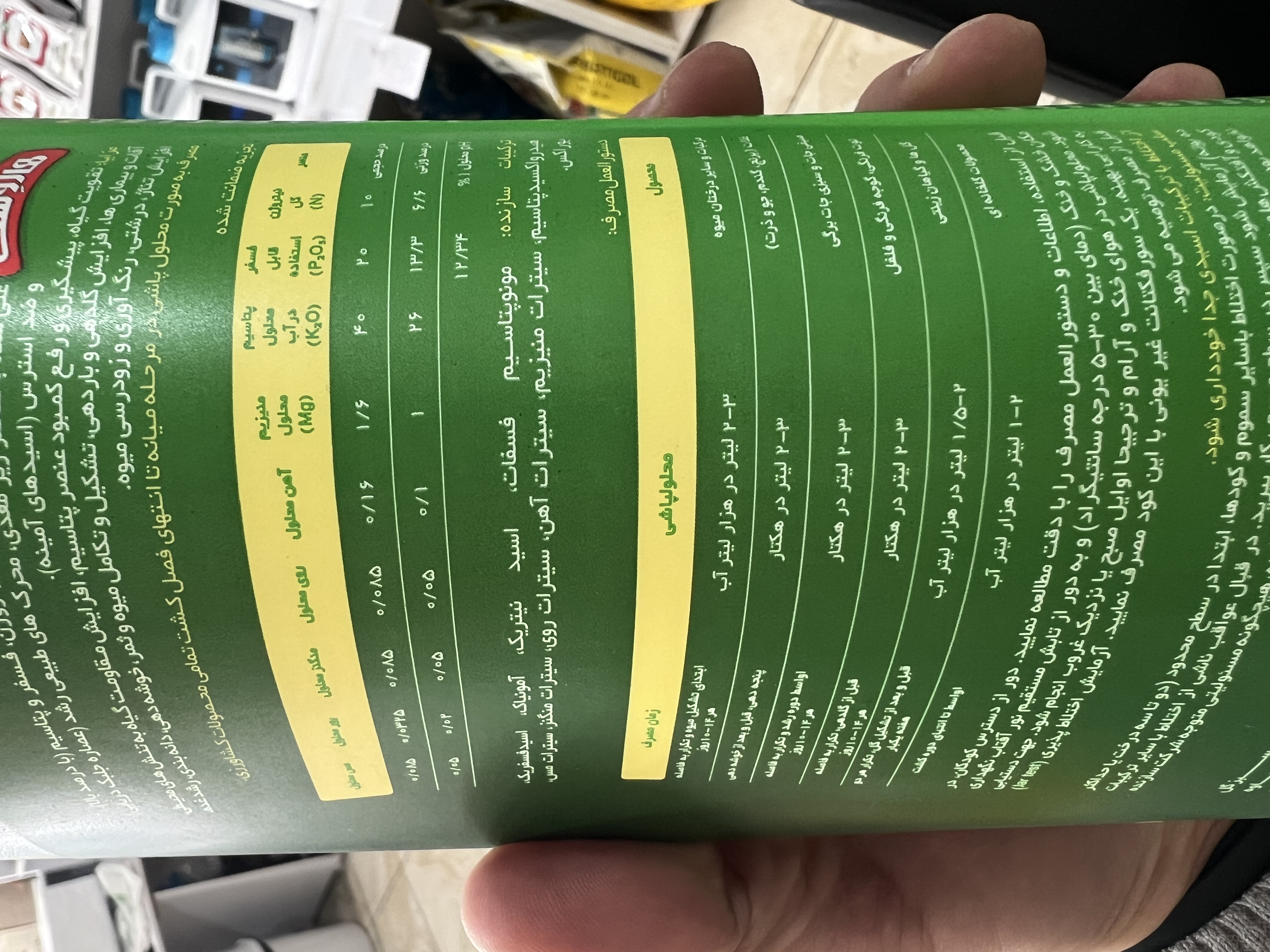 ترکیبات: عناصر ماکرو(نیتروژن-فسفر-پتاسیم) + عناصر میکرو(آهن-روی-منگنز-منیزیم-مولیبدن-بور) + آمینو اسید + ویتامینهای B1 B2 C E