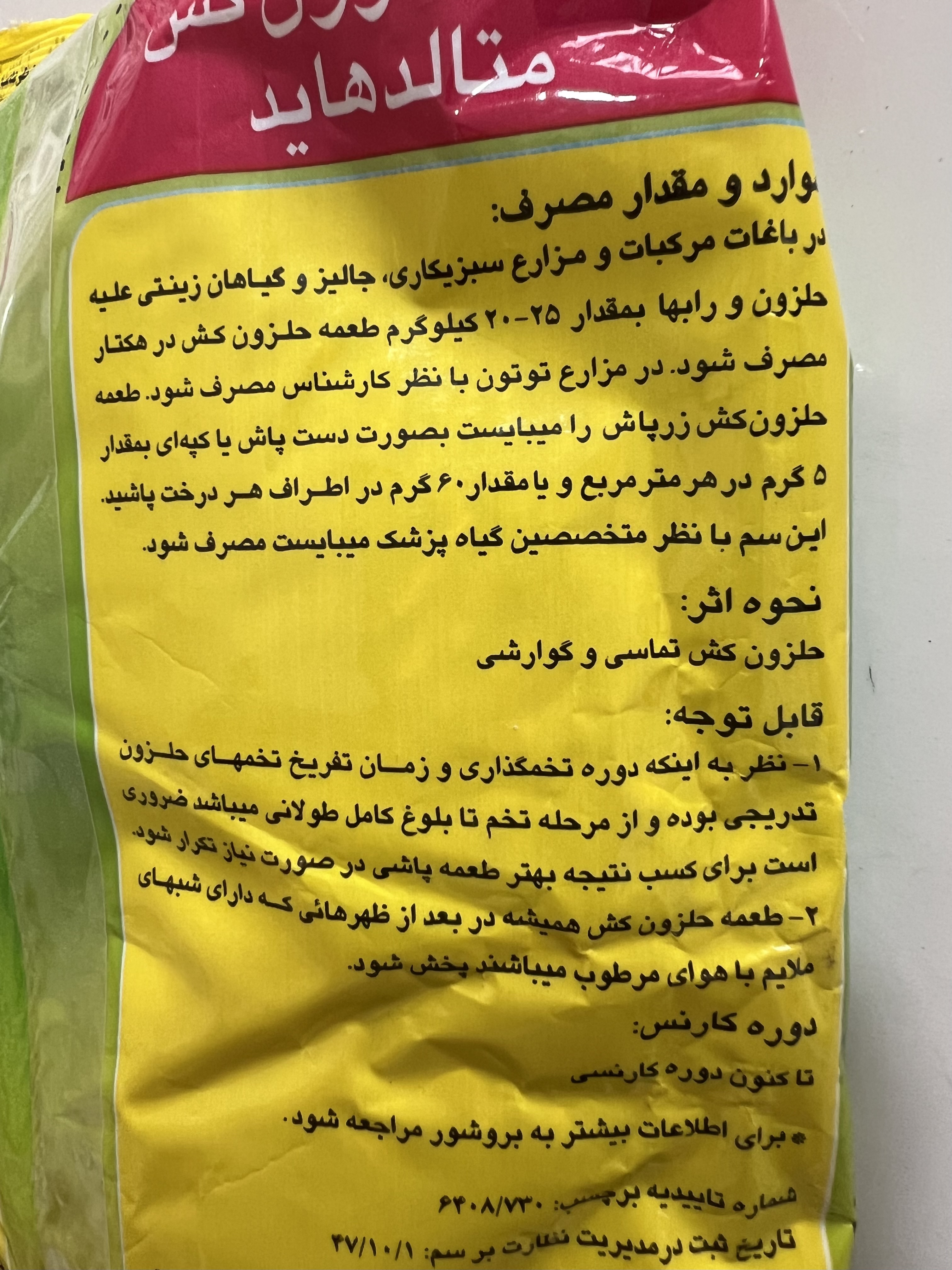 دستهبندی: حشره کشسایز: ۱ کیلوگرممورد مصرف: از بین بردن حلزونها و لیسکهامحصول شرکت: زرپاشترکیبات: متادهاید ۶٪