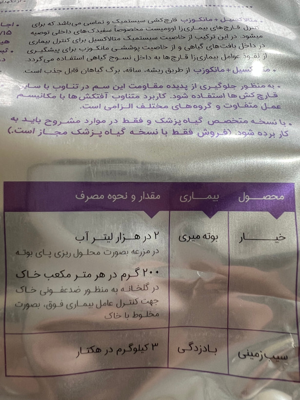 در زمان مصرف سم متالاکسیل-مانکوزب باید سطح برگهای گیاه خشک باشد و سمپاشی در هوای خنک صبح یا عصر صورت گیرد.